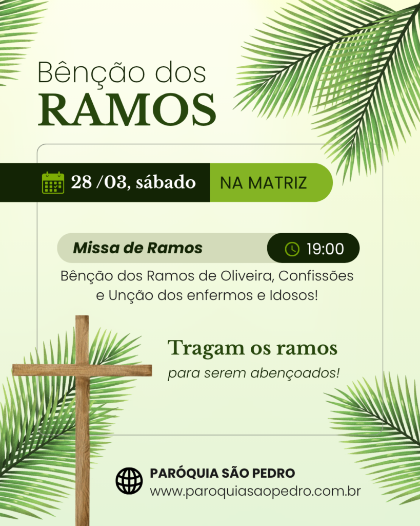 - 28/03, sábado, 19h: Missa com Benção dos Ramos de Oliveira, Confissões e Unção dos enfermos e Idosos.